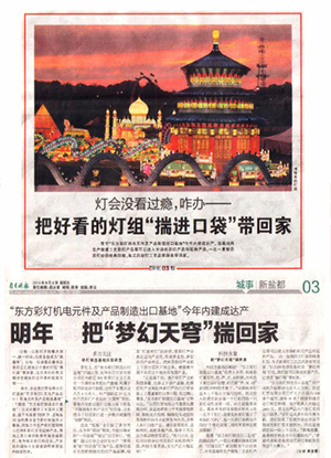 “正是基于此,提升彩燈產(chǎn)業(yè)的科技含量、完善上下游產(chǎn)業(yè)鏈、拓展衍生產(chǎn)業(yè)和加快彩燈產(chǎn)品出口貿(mào)易提上了最重要的議事日程,經(jīng)過精心籌備,‘東方彩燈制造出口基地’應(yīng)勢(shì)而生?!弊载暉糍Q(mào)有限公司董事長(zhǎng)蔡翔介紹,該基地將著力于無線音頻控制、智能變光控制、精細(xì)化傳動(dòng)控制等高新科技技術(shù)的研發(fā)與應(yīng)用,并嵌入彩燈創(chuàng)意產(chǎn)品、城市景觀亮化、道路照明、高新圣誕產(chǎn)品、微縮工藝品及仿真動(dòng)物類等項(xiàng)目,“換句話說,這些項(xiàng)目將會(huì)讓自貢彩燈實(shí)現(xiàn)提檔升級(jí),科技含量更高,文化產(chǎn)品大幅延伸!”
