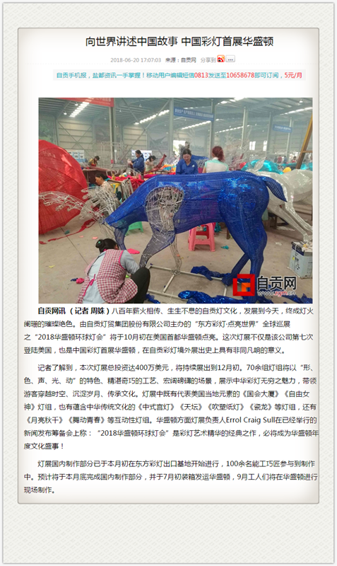 “2018華盛頓環(huán)球燈會”是東方彩燈第七次登陸美國,也是中國彩燈首展美國政治中心——華盛頓,受到各界廣泛關注。近日,《四川日報》、《自貢日報》等多家官方媒體對本次燈展做了專題報道。