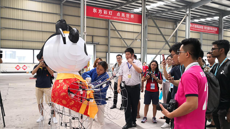 走進(jìn)東方彩燈出口基地,來(lái)到“東方彩燈 點(diǎn)亮世界”項(xiàng)目境外燈展制作現(xiàn)場(chǎng),青年朋友們近距離的詳細(xì)了解了彩燈的制作流程和工藝。交流團(tuán)成員為東方彩燈足跡遍布世界30多個(gè)國(guó)家咋咋稱(chēng)奇,為燈貿(mào)集團(tuán)精妙絕倫的彩燈頻頻點(diǎn)贊。