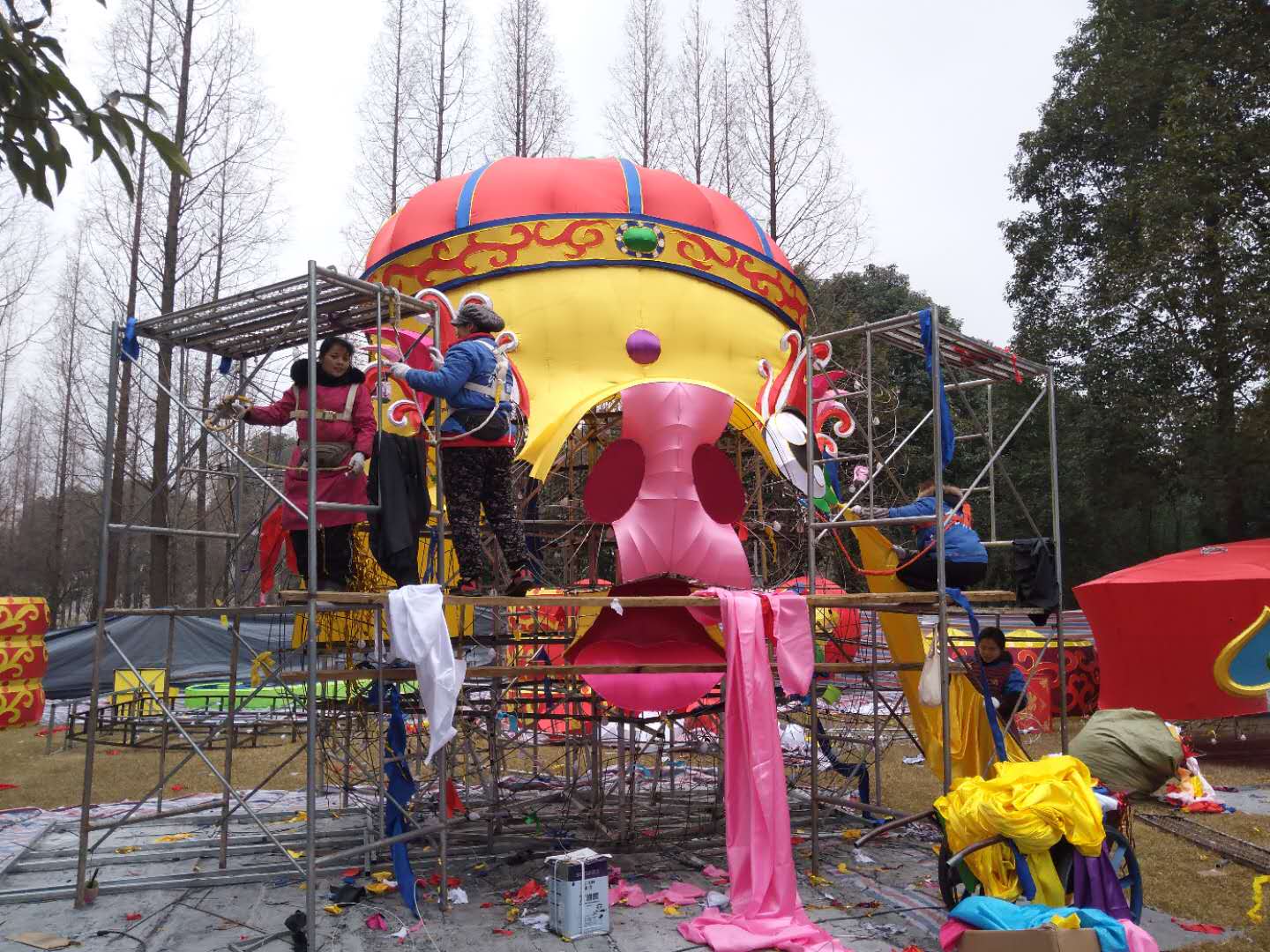 目前,東方彩燈身懷技藝的制燈匠人正緊鑼密鼓的制作中。那些看上去冰冷粗獷的鐵絲、綢緞,在他們“馴化”下變得溫順隨和,一組組或生動、或委婉、或雄渾的燈組栩栩如生。本屆“太陽節(jié)”較大的突破是所有燈組均采用節(jié)能環(huán)保燈具,較之往年減少三分之二的用電負荷,打造炫彩奪目的燈光效果的同時,保護了環(huán)境和游客。在制作方面,部分主要大型燈組均采用加密色丁布裝飾,傳統(tǒng)燈組結(jié)合現(xiàn)代科技,民俗風情融合時尚藝術(shù),集現(xiàn)代感、藝術(shù)感為一體,凸顯顏色豐富的層次感。