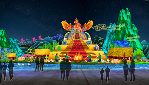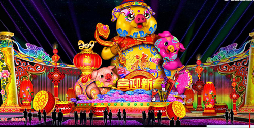 本屆太陽節(jié)以《太陽崇拜》、《玉米門神》等瑪雅諸神燈組,以及《夢幻森林》、《動物世界》里與瑪雅人息息相關(guān)的動物燈組,與《古蜀文明》、《古蜀生活》中古蜀人漁獵農(nóng)耕和祭祀相關(guān)的燈組交相輝映。園區(qū)氛圍營造也極具特色,瑪雅象形文字、古蜀紋飾等元素將帶領(lǐng)觀眾進入兩大文明交匯的海洋。當然,應(yīng)景的“年味兒”也必不可少,東方彩燈打造金沙節(jié)史上最大的立體生肖豬造型,向觀眾送上新年祝福。