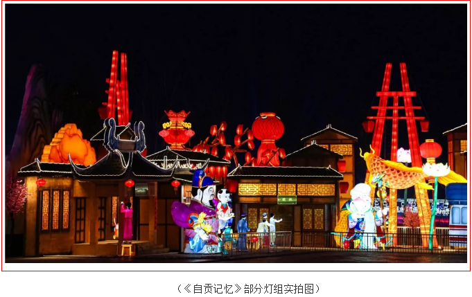 《自貢記憶》主燈組使用傳統(tǒng)材質(zhì)結(jié)合現(xiàn)代工藝,宏偉的天車獨(dú)創(chuàng)性的使用啤酒瓶制作,配合追光變色形成絢麗奪目的燈光效果。顯示屏剪影式表現(xiàn)自貢元素??铸埓┬?、錦鯉游動(dòng),還有靈活靈現(xiàn)的自貢歷史場(chǎng)景和人物,還原了一幅原滋原味又生動(dòng)的老自貢記憶。