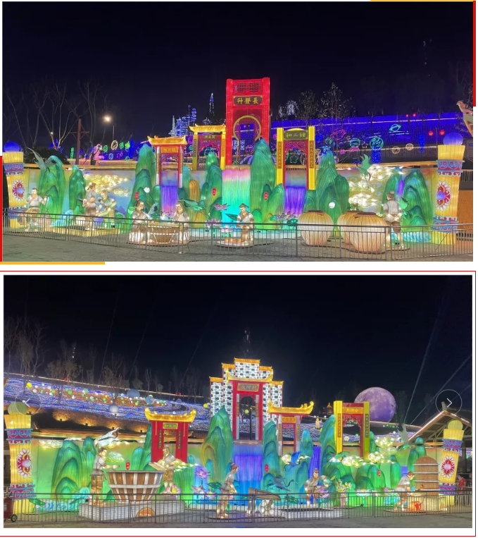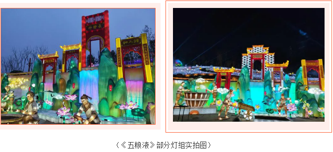 《五糧液》主燈組采用第八代五糧液酒瓶運(yùn)用自貢彩燈傳統(tǒng)工藝?yán)υ删扌臀寮Z液,輔以仙山、仙境、巨龍騰越氛圍闡釋五糧傳奇,杯酒時(shí)光,百年味道。周邊群燈組展示封存在時(shí)光中的“活窖池”--利川永、張萬(wàn)和、劉鼎興、天賜福、聽(tīng)月樓、全恒昌等八家明代釀酒作坊,歷史悠久的古窖池群講述著傳承幾百年的五糧液釀酒工藝,折射幾千年氤氳酒香的中國(guó)酒歷史和酒文化。