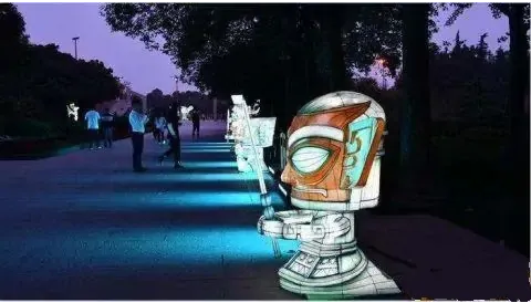 據(jù)自貢燈貿(mào)集團(tuán)設(shè)計(jì)總監(jiān)陳潔介紹,在入口廣場處的燈組以青銅縱目面具為設(shè)計(jì)原型,作為三星堆“六大國寶”之一的青銅縱目面具,寬1.38米,高0.645米,眼睛呈柱狀向外凸,是館藏中形體最大的青銅面具。本燈組按比例還原青銅縱目面具,燈組高3.2米,寬3.4米。