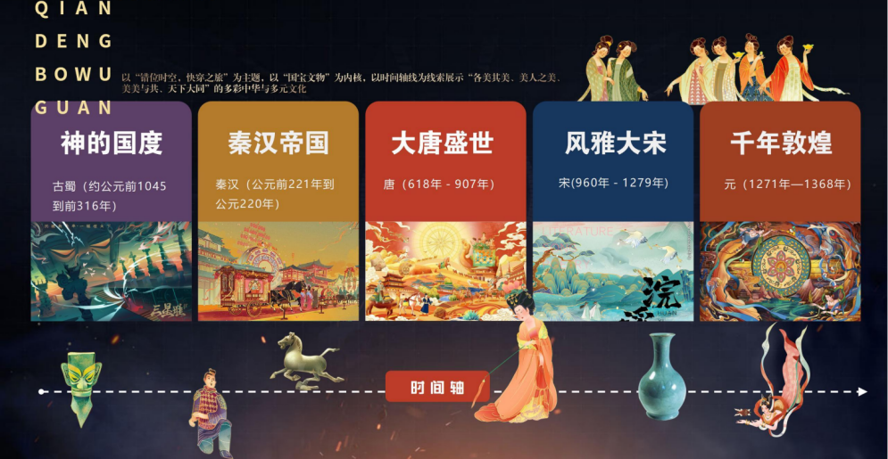 自貢燈貿(mào)集團(tuán)承制的第29屆自貢國(guó)際恐龍燈會(huì)《千燈博物館》燈組以“錯(cuò)位時(shí)空,快穿之旅”為主題,以“國(guó)寶文物”為內(nèi)核,以時(shí)間軸為線索展示“各美其美、美人之美、美美與共、天下大同”的多彩中華與多元文化。用故事化、場(chǎng)景式的方式讓游客體驗(yàn)文物背后的文化,仿佛身臨文物當(dāng)年的時(shí)代。